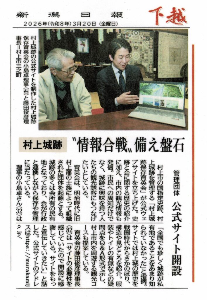 2026年3月20日 未分類 メディアに掲載されました TWEET SHARE LINE COPY LINK 村上城公式サイトの取組みが地元紙「新潟日報」様(リンク)に掲載されました。 R8.3.20『新潟日報』様 「メディアに掲載されました」へのコメント コメントはありません コメントを残す コメントをキャンセルメールアドレスが公開されることはありません。 ※ が付いている欄は必須項目ですコメント ※ 名前 ※ メール ※ サイト 次回のコメントで使用するためブラウザーに自分の名前、メールアドレス、サイトを保存する。 上に表示された文字を入力してください。