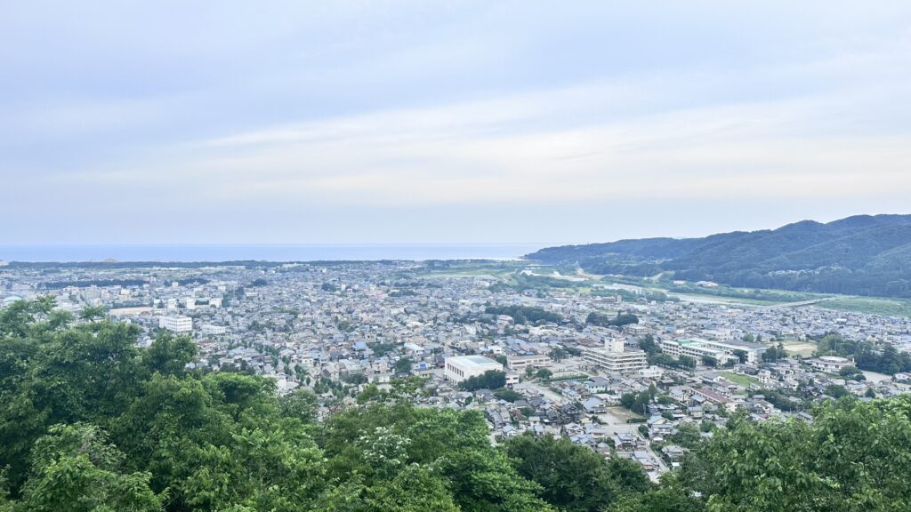 山頂からは城下町と日本海が一望でき、晴れた日には粟島や佐渡島、遠く会津磐梯山まで見渡せます。眼下を流れる三面川や朝日連峰の山並みが織りなす景観は、まさに“山紫水明の地”です。