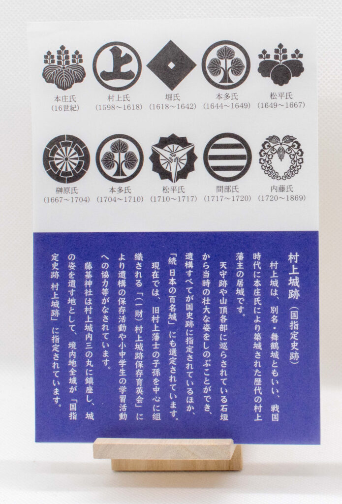 戦国~江戸時代にかけて村上城を治めた歴代城主十家の家紋が押印されているのが魅力です。